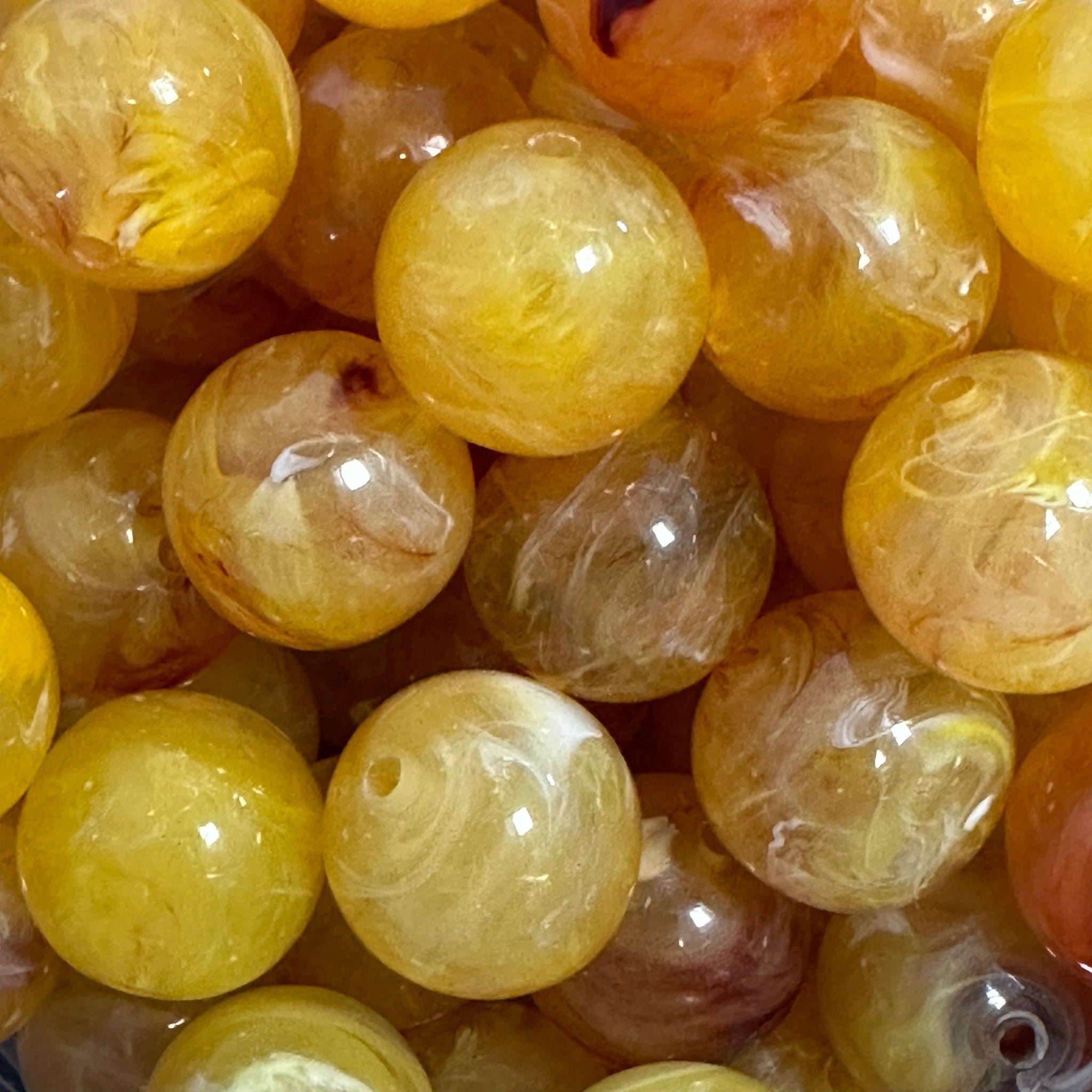 Ronde acryl kraal met een gemarmerde afwerking, uitgevoerd in Geel. Licht van gewicht en ideaal voor sieraden of creatieve projecten waarbij een warme kleur gewenst is.