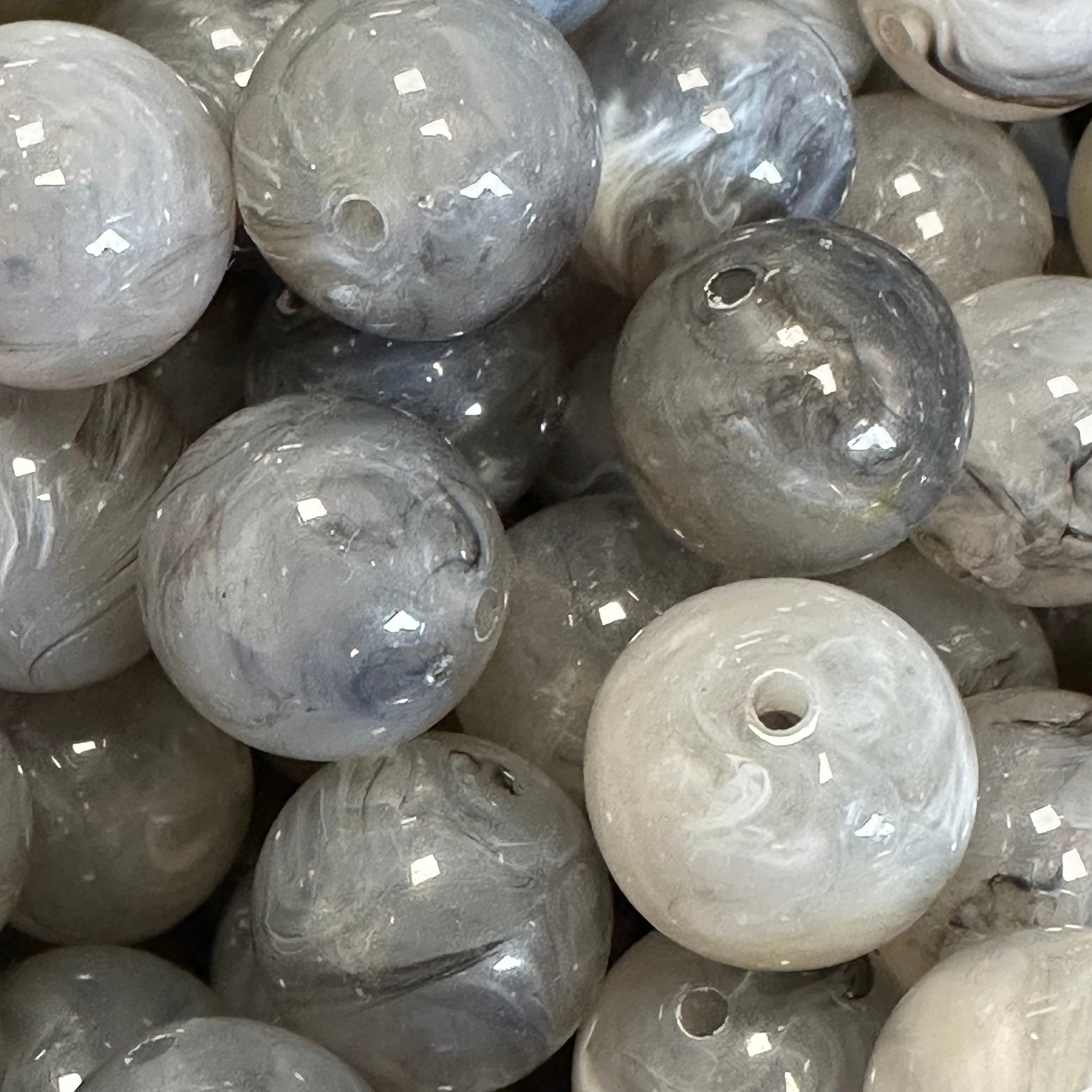 Ronde acryl kraal met een gemarmerde afwerking, uitgevoerd in Grijs. Licht van gewicht en ideaal voor sieraden of creatieve projecten waarbij een warme kleur gewenst is.