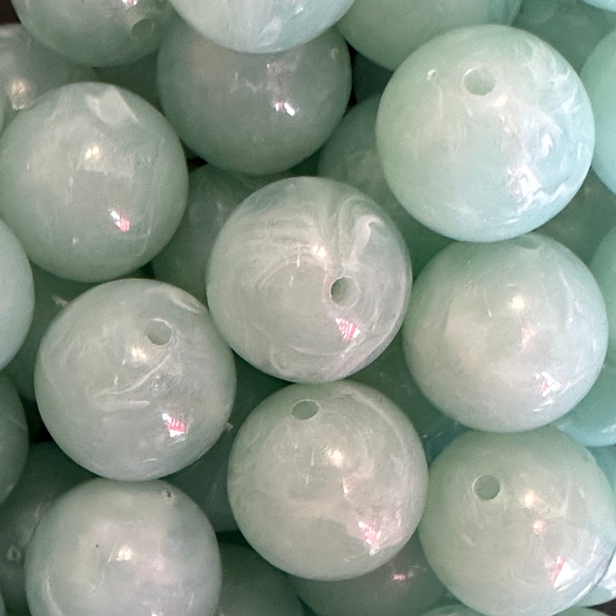 Ronde acryl kraal met een gemarmerde afwerking, uitgevoerd in een grijs groenekleur. De kraal is licht van gewicht en ideaal voor sieraden of creatieve projecten waarbij een warme kleur gewenst is.