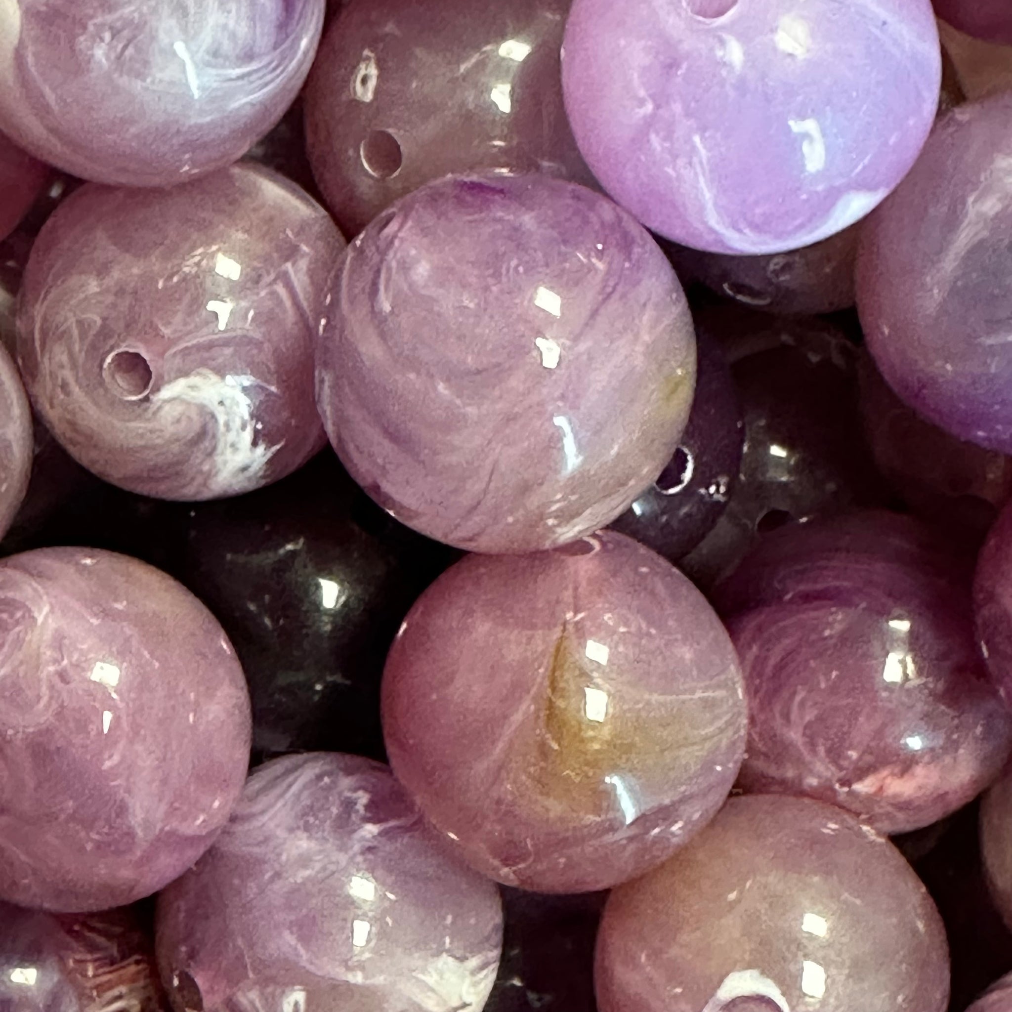 Ronde acryl kraal met een gemarmerde afwerking, uitgevoerd in Paars. Licht van gewicht en ideaal voor sieraden of creatieve projecten waarbij een warme kleur gewenst is.