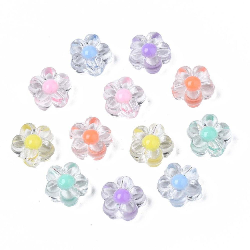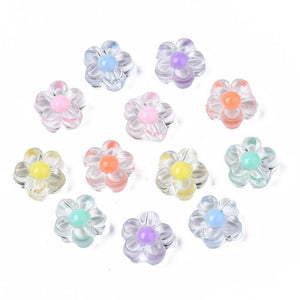 Unieke acryl kralen in transparante uitvoering, met een vrolijk bloemmotief verwerkt ín de kraal. Dankzij de verschillende kleuren ontstaat een speels en kleurrijk effect, perfect voor creatieve sieraden en decoratieve projecten.