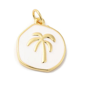 Prijs per stuk. Ronde messing bedel met wit emaille en een afbeelding van een palmboom. De bedel heeft een 18kr gouden plating en is 18mm lang, 15,5mm breed en het oogje is 3,4mm. Aan het bedeltje is al een ringetje bevestigd van 5x0,8mm.