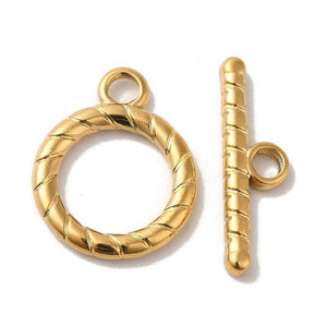 Prijs per set. Complete sluiting rond met streefmotief en 18k gouden plating. De bar is 21mm lang en 2mm breed met een gat van 3mm. De ring is 19mm lang en 15mm breed met een gat van 3mm.
