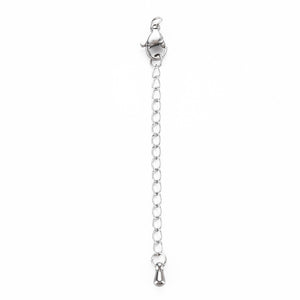 Stevige verlengketting van roestvrij staal met een gladde zilverkleurige afwerking. Voorzien van een karabijnsluiting, een elegante druppel aan het uiteinde en volledig tarnish resistant — ideaal om kettingen of armbanden in lengte te verstellen.