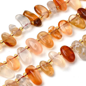 Deze nuggetvormige kraal is gemaakt van natuurlijke carneool en heeft een warme oranje- tot roodtint met een levendige uitstraling. De kraal is top-drilled, waardoor hij zeer geschikt is als hanger of als opvallend accent in armbanden en kettingen. Door de organische vorm is elke kraal uniek.