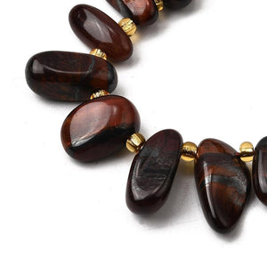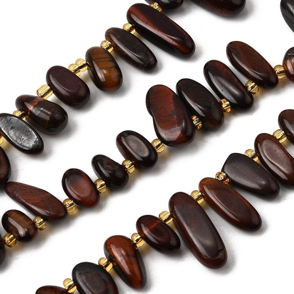 Deze nuggetvormige kraal is gemaakt van natuurlijk tijgeroog dat rood is geverfd voor een diepe, warme tint. De kralen hebben een gepolijste tumbled afwerking en zijn top-drilled, waardoor ze perfect zijn voor hangers, oorbellen en unieke accenten in armbanden of kettingen.