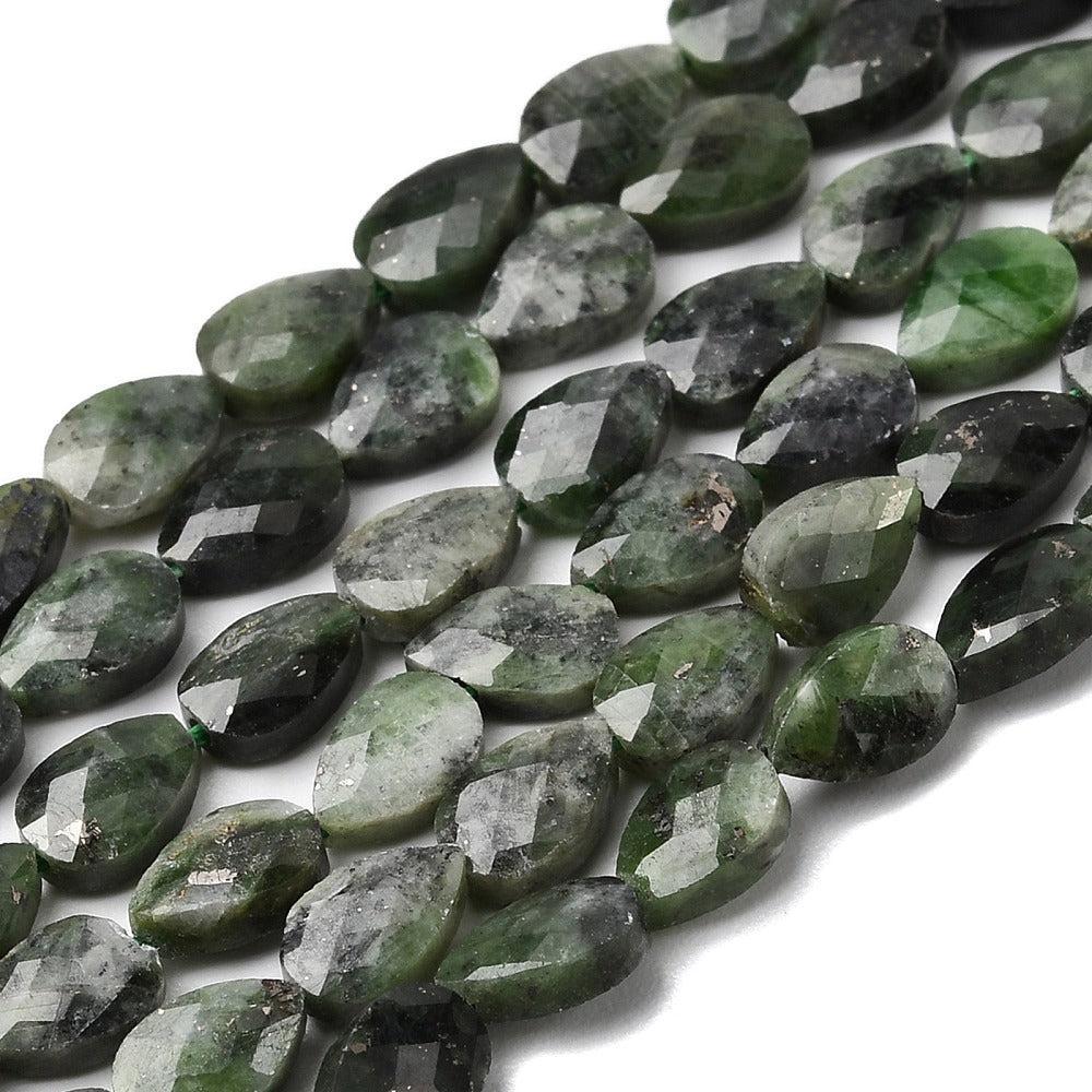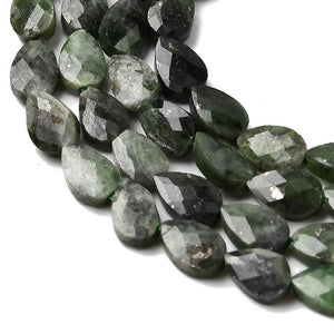 Prachtige natuurlijke groene diopsiet kraal in verfijnde druppelvorm. De diepe, levendige groentint en de facetgeslepen afwerking zorgen voor een schitterende, elegante uitstraling — ideaal voor luxe en verfijnde sieraden.