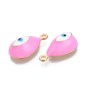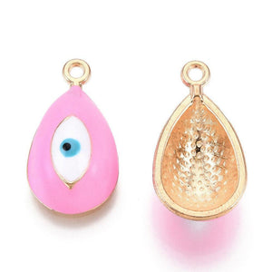 Elegante metalen hanger in traanvorm met het klassieke evil eye design, symbool voor bescherming en geluk. De hanger heeft een diepe roze emaille afwerking en een glanzende lichtgouden rand — een opvallend accent in elke sieradencollectie.
