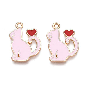 Prijs per stuk. Goud kleurige metaal bedel in de vorm van een kat met een harte en roze / rode emaille . De bedel is 21mm lang, 14,5mm breed en het oogje is 1,6mm.