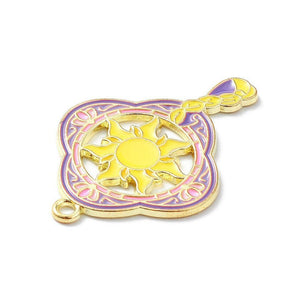 Betoverende metalen hanger met een sierlijk sprookjesthema, versierd met een zon en verfijnde details in gele en paarse tinten. De glanzende emaille afwerking en lichtgouden basis geven de hanger een magische, dromerige uitstraling — perfect voor sieraden met een fantasievolle touch.