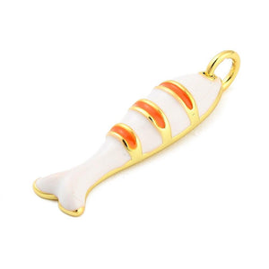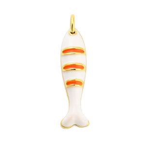 Deze verfijnde vis hanger is gemaakt van messing en afgewerkt met een strakke witte emaille laag. De hanger is voorzien van een duurzame rack plating met ion plating en een echte 18K goud vergulde afwerking. Het slanke ontwerp met ringetje maakt deze hanger perfect voor elegante, zomerse en symbolische sieraden.