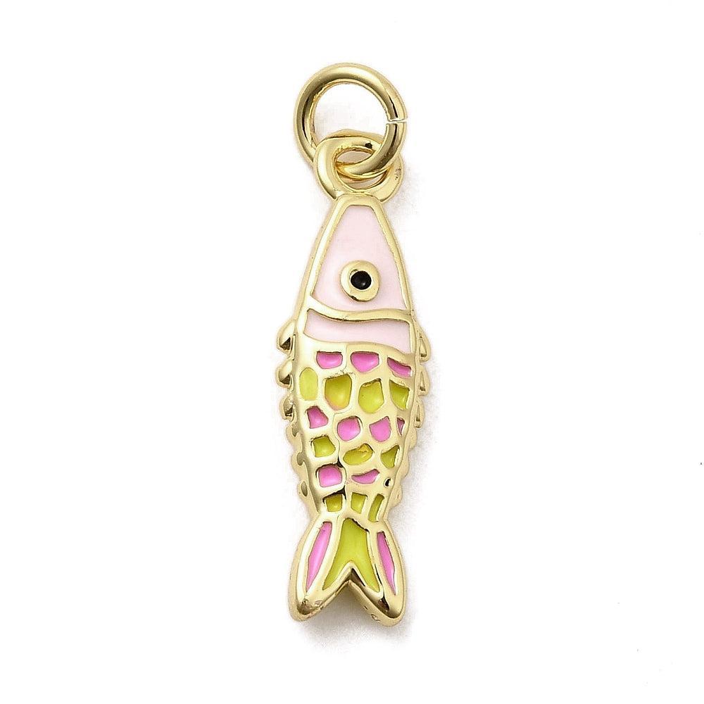 Vrolijke emaille bedel in de vorm van een vis, uitgevoerd in roze en afgewerkt met een luxe 18K goud plating. De bedel is voorzien van een oogje (jump ring), waardoor je hem direct kunt verwerken in sieraden of accessoires.