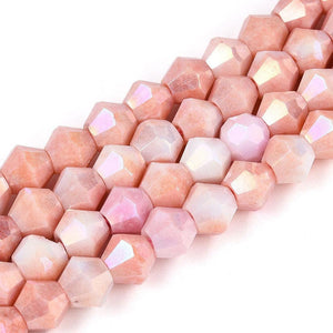 Elegante bicone glas kralen met een AB-coating die zorgt voor een extra schitterende glans. De kralen zijn facet geslepen en uitgevoerd in een zachte zalmkleur.