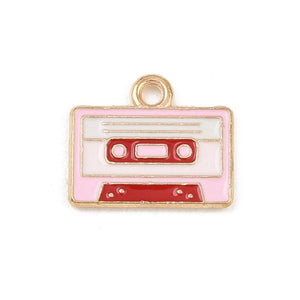 Speels emaille bedeltje in de vorm van een cassettebandje, uitgevoerd in lichtgoud met rood en roze details. Dit hangertje geeft je sieraden direct een leuke retro uitstraling en past perfect in Valentine’s Day ontwerpen, maar ook in vrolijke everyday sieraden.