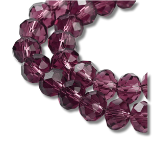 Deze handgemaakte glaskralen hebben een diepe paarse kleur en een elegante facetgeslepen rondelvorm. Door het ambachtelijke productieproces hebben de kralen een karakteristieke uitstraling die perfect past bij unieke en stijlvolle sieradenontwerpen.