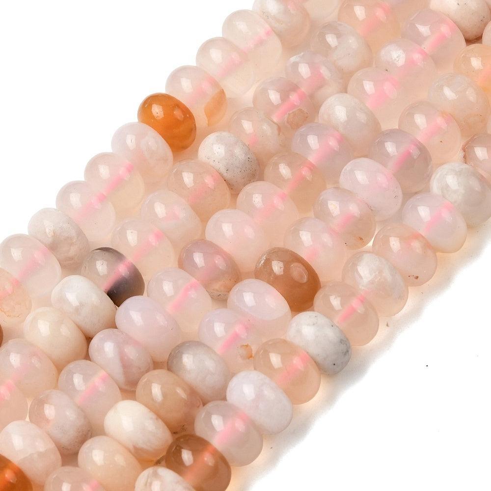 Deze cherry blossom agaat rondel kralen hebben een zachte, romantische uitstraling met natuurlijke kleurnuances die doen denken aan bloesem. De rondelvorm geeft een elegant lijnenspel en is perfect voor armbanden en kettingen met een warme, dromerige edelsteenlook.