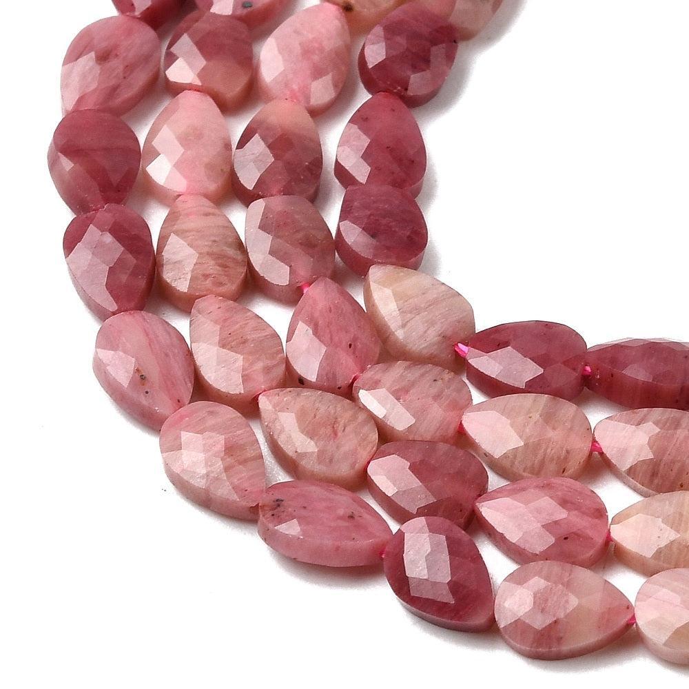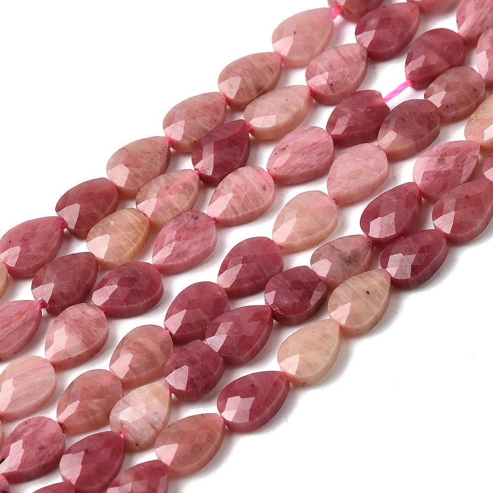 Elegante natuurlijke rhodoniet kraal in druppelvorm, herkenbaar aan zijn warme roze tint. De facetgeslepen afwerking geeft deze kraal een subtiele schittering — ideaal voor sieraden met een zachte, natuurlijke uitstraling.