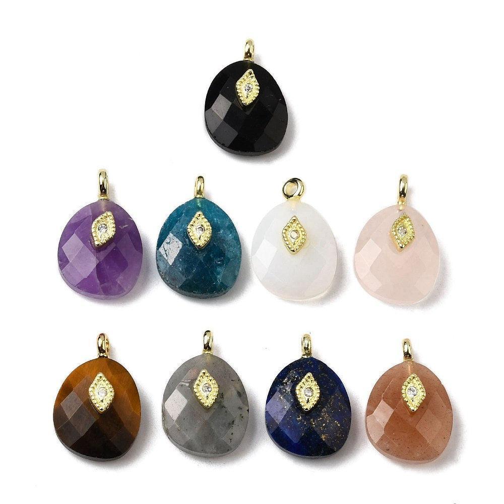Deze luxe facetgeslepen druppelhanger is verkrijgbaar in verschillende natuurstenen, elk met een eigen unieke uitstraling. De hanger is afgewerkt met een messing oogje voorzien van zirconia en een duurzame real 18K gold plated coating. Perfect als elegante hanger voor kettingen, armbanden of oorbellen.