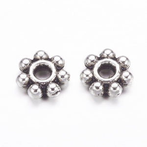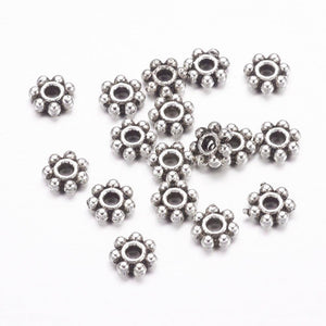 Decoratieve spacer kralen in bloemvorm, uitgevoerd in antiek zilverkleurig metaal. Perfect om accenten te leggen tussen kralen en je sieraden een speelse, verfijnde uitstraling te geven.