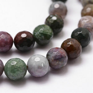 Prachtige natuurlijke Indiase agaatkralen met een subtiel facetgeslepen oppervlak. De kralen tonen een mix van aardse tinten – variërend van groen en bruin tot rood en beige – en hebben een rustige, harmonieuze uitstraling.