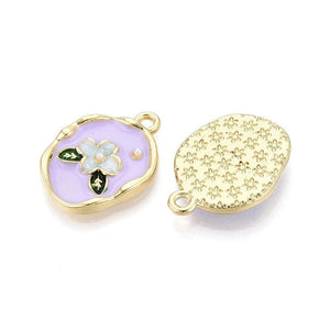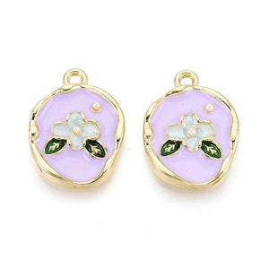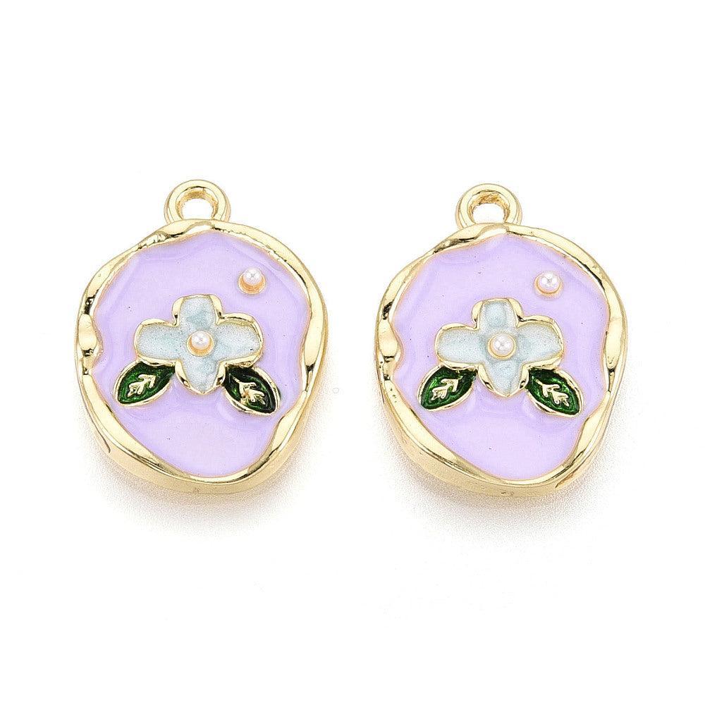 Elegante emaille bedel in ovale vorm met een bloemenmotief en een ingelegde acryl imitatieparel. Uitgevoerd in lichtgoud met lila details voor een chique en romantische uitstraling.