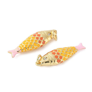 Stijlvolle emaille bedel in de vorm van een vis, uitgevoerd in goudkleur en verfraaid met fonkelende zirkonia steentjes. De luxe 18K goud plating zorgt voor een elegante en tijdloze uitstraling.