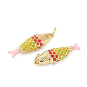 Vrolijke emaille bedel in de vorm van een vis, uitgevoerd in geelgroen en versierd met fonkelende zirkonia steentjes. Dankzij de luxe 18K goud plating krijgt deze bedel een frisse en elegante uitstraling.