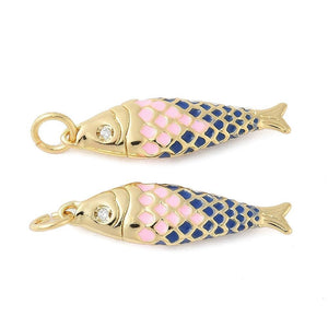 Prachtige emaille bedel in de vorm van een vis, uitgevoerd in blauw en versierd met fonkelende zirkonia steentjes. Dankzij de luxe 18K goud plating krijgt deze bedel een elegante en tijdloze uitstraling.