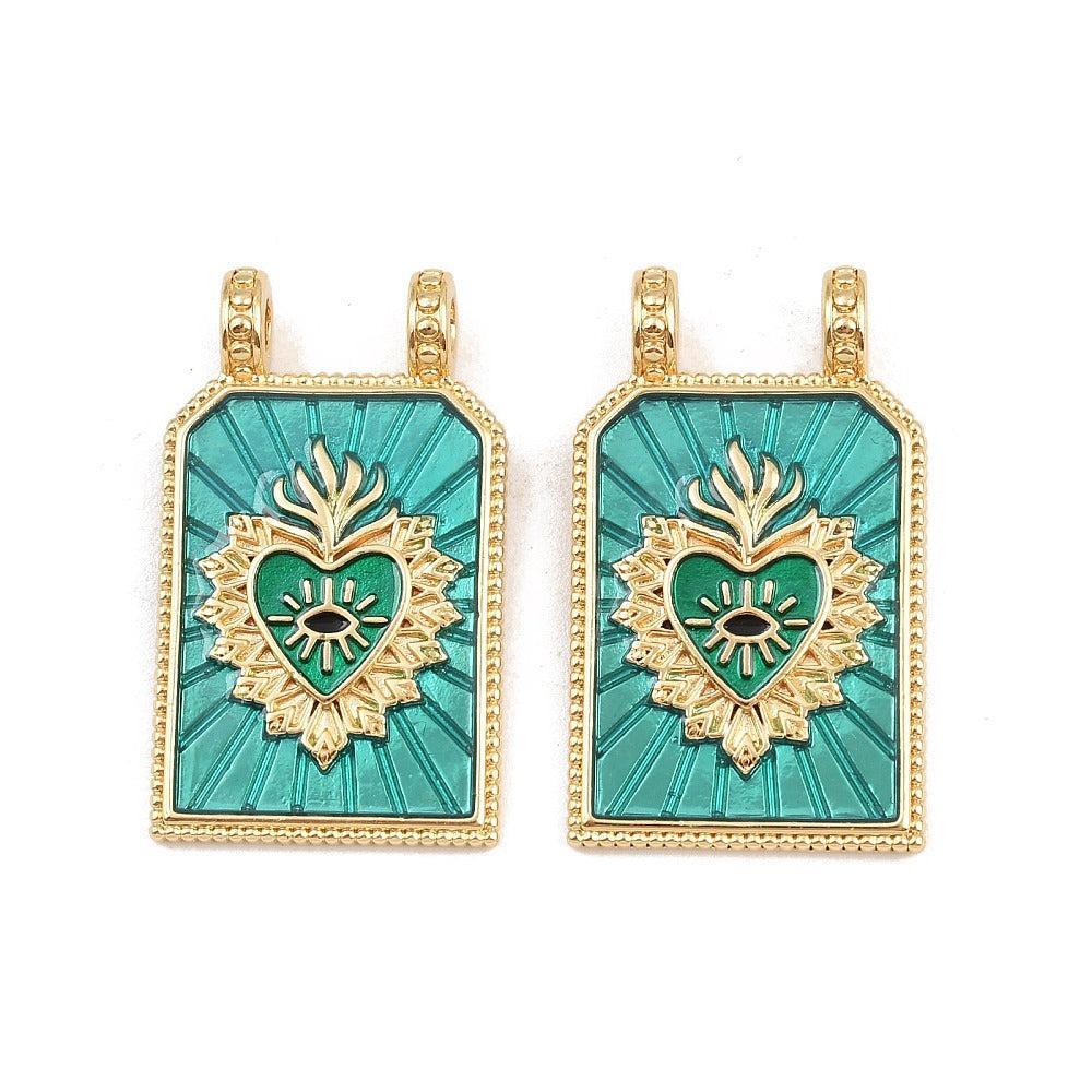 Mooie emaille bedel in rechthoekige vorm met een gedetailleerd Sacred Heart design. Uitgevoerd in turquoise met een luxe 18K goud plating, wat de bedel een spirituele en stijlvolle uitstraling geeft.