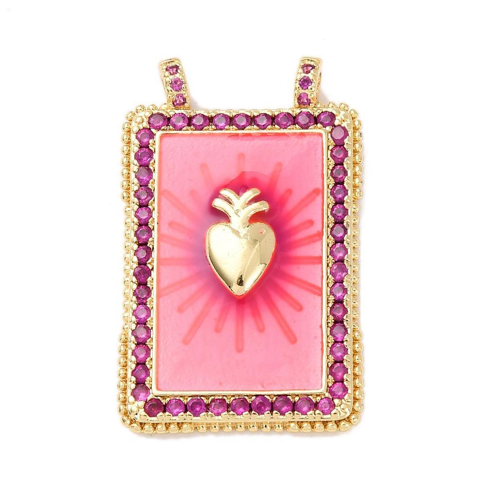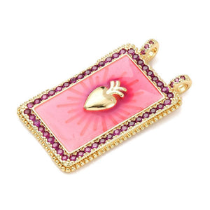 Opvallende brass bedel in rechthoekige vorm met een hartmotief, afgewerkt met roze emaille en fonkelende zirkonia steentjes. De luxe 18K goud plating geeft deze hanger een elegante en moderne uitstraling.