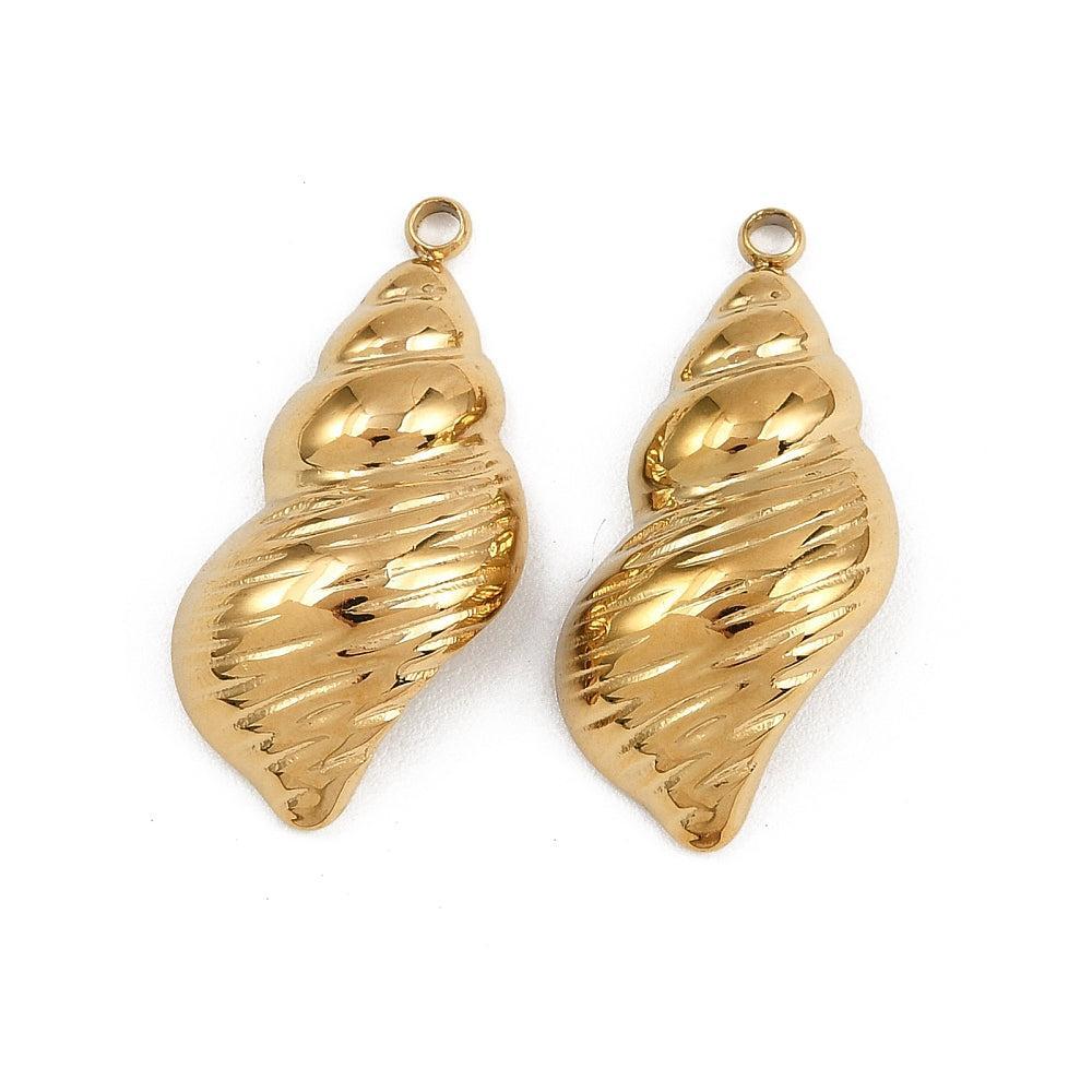 Stijlvolle RVS bedel in de vorm van een schelp (conch), uitgevoerd in goudkleur. Het duurzame roestvrij staal zorgt voor een sterke hanger die lang mooi blijft.