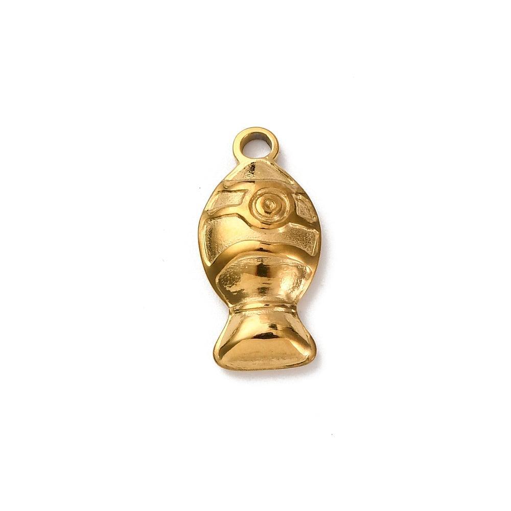 Mooie RVS bedel in de vorm van een vis, uitgevoerd in goudkleur. Het stevige roestvrij staal maakt de hanger duurzaam en geschikt voor dagelijks gebruik.