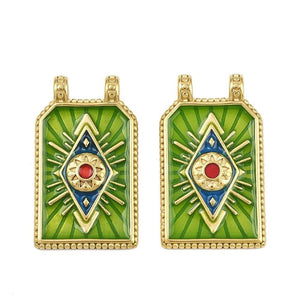 Bijzondere RVS bedel in rechthoekige vorm met een evil eye design, uitgevoerd in olijfgroen emaille. De hanger is met de hand gepolijst en afgewerkt met een luxe 18K goud plating via premium ion plating, waardoor hij een hoogwaardige en duurzame uitstraling heeft.
