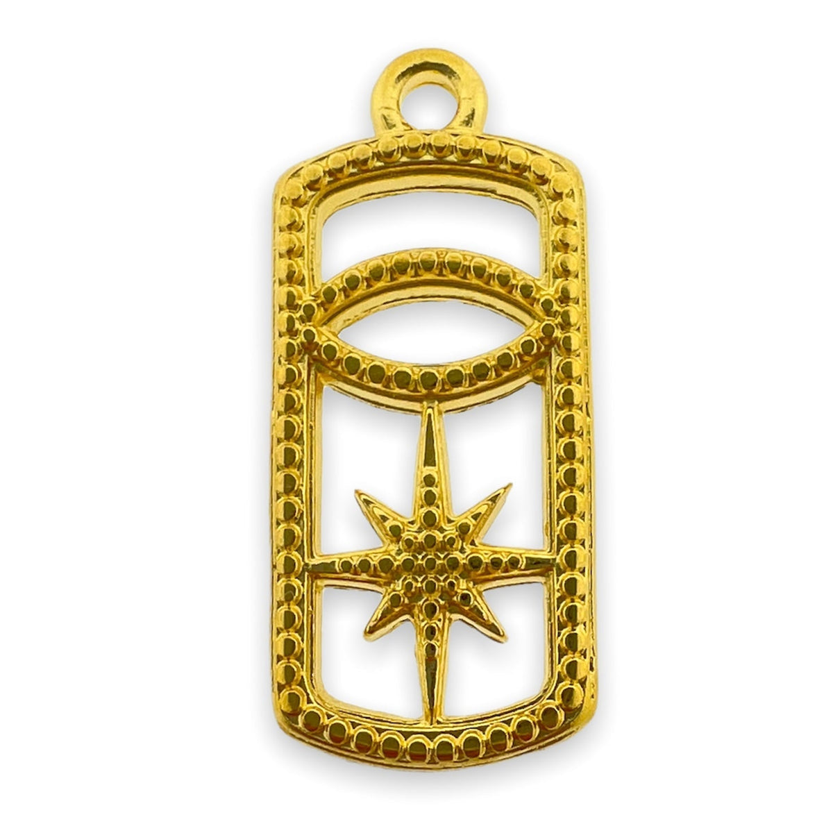 Prijs per stuk. Goud kleurige metaal bedel. De bedels zijn gemaakt van Europees DQ metaal. De bedel is 10mm hoog en 22mm breed.