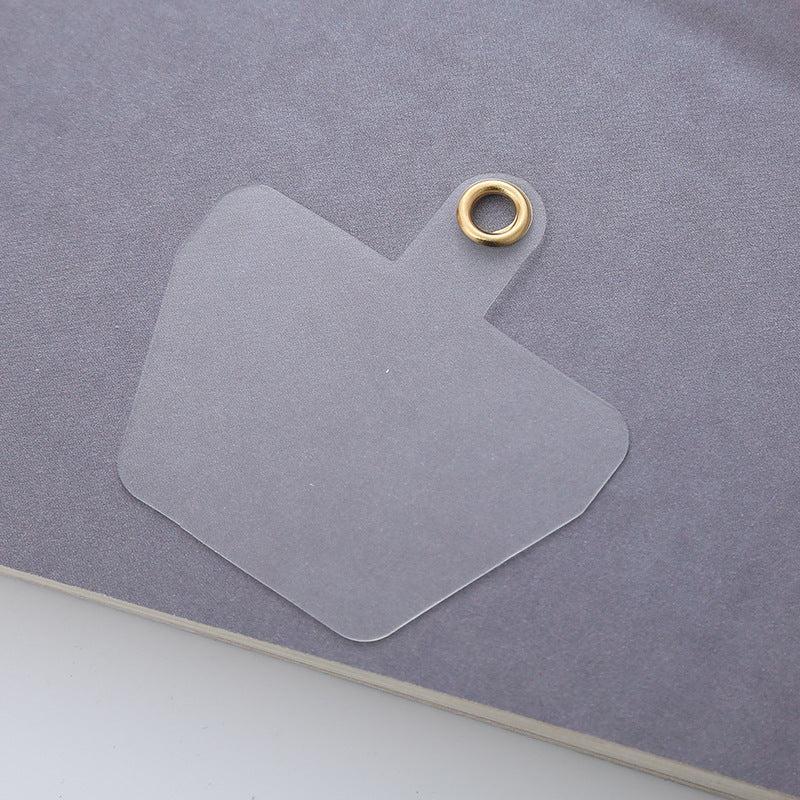 Bevestigingsplaatje om een telefoonkoord aan te maken. Het plaatje is 53mm breed en 35mm lang. Het plaatje is transparant met een gouden ringetje.