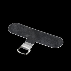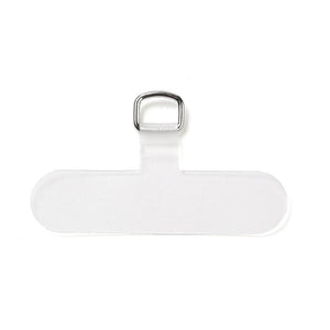 Bevestigingsplaatje om een telefoonkoord aan te maken. Het plaatje is 60mm breed en 35mm lang. Het plaatje is transparant met een zilveren ringetje van 9x7mm.