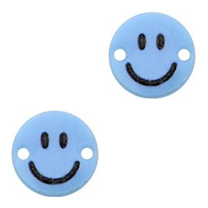Prijs per stuk. Blauw kleurige kunststof tussenzetsel smiley. De bedels zijn gemaakt van plexiglas/kunststof. De bedel is 12mm hoog, 12mm breed en heeft een doorsnede van 1,6mm.