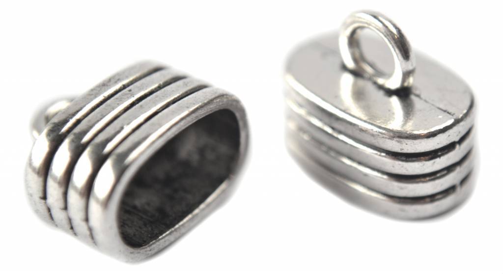 Prijs per stuk. Metalen eindkap met een gat van 12x7mm. De metalen eindkap strepen kan gebruikt worden voor meerdere koordjes; zoals het stiched leer, rondgevlochten leer en rond leer in verschillende maten.
