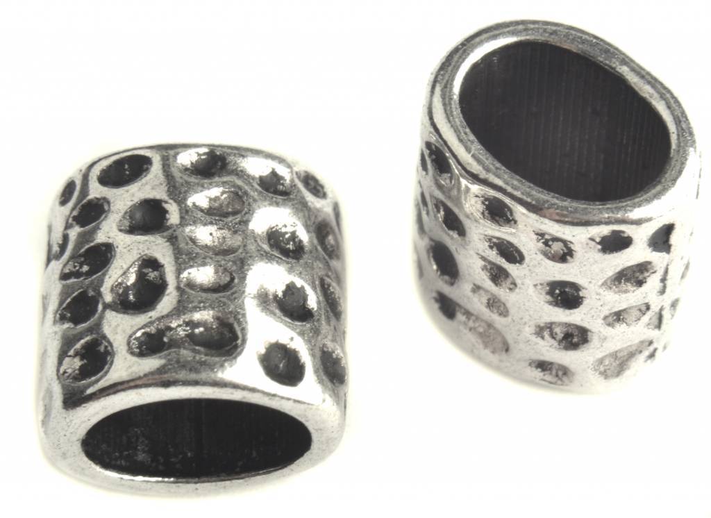 Prijs per stuk. Kraal van zilverkleurig metaal in de vorm van een ovaal met butsen. De kraal is 12mm groot met een gat van 9mm breed en 6mm hoog.